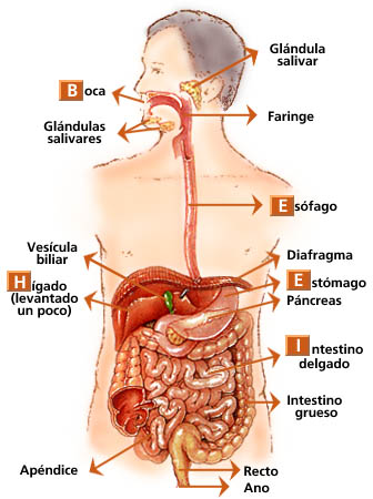 Desde la boca hasta el ano, el tubo digestivo mide unos once metros de longitud. En la boca ya empieza propiamente la digestión. Los dientes trituran los alimentos y las secreciones de las glándulas salivales los humedecen e inician su descomposición química. Luego, el bolo alimenticio cruza la faringe, sigue por el esófago y llega al estómago, una bolsa muscular de litro y medio de capacidad, en condiciones normales, cuya mucosa segrega el potente jugo gástrico, en el estómago, el alimento es agitado hasta convertirse en el quimo.